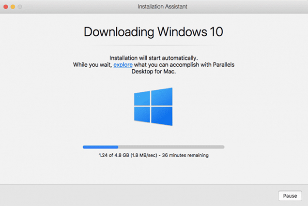 To launch the installer, click the Install Windows button, and the Parallels application will begin downloading Windows 10 for the Mac device.